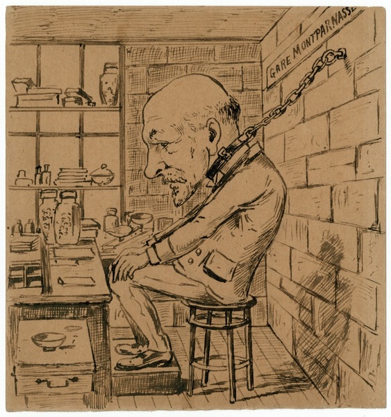 Seule sa passion pour le dessin subsiste sans demander trop de moyens, et c’est dans ces conditions qu’il se caricaturera enchainé derrière le comptoir de sa petite boutique, à la manière d’un prisonnier forcé de travailler.