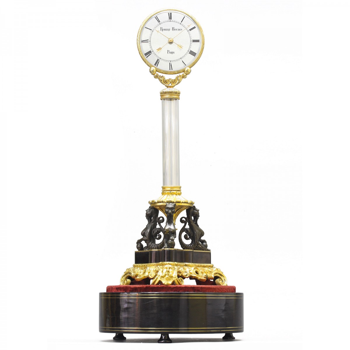 Deux ans plus tard, Robert-Houdin remet cela et propose une nouvelle idée qu’il commercialise sous le nom de Pendule mystérieuse. Il associe avec cette innovation la mécanique, l’horlogerie et un soupçon de magie. Cette pendule d’un genre spécial donne l’heure de manière étonnante : les aiguilles ne semblent reliés à rien d’autre d’un cadran entièrement transparent, ne montrant aucun mécanisme apparent. Il existe plusieurs versions de cette pendule, dont la plus belle est sans doute celle dite à « trois mystères ». Le premier mystère consiste en des aiguilles qui bougent sans mécanisme apparent. Le second mystère tient du fait que le cadran repose sur un cylindre entièrement transparent, montrant qu’il n’y a aucune transmission possible. Enfin, le dernier mystère réside dans le socle qui ne semble pas relié à l’ensemble précédemment décrit. En cela, cette pendule donne l’heure sans aucun mécanisme apparent, un objet d’art qui est une prouesse pour l’époque et qui ne fait qu’accroître la popularité de Robert-Houdin.