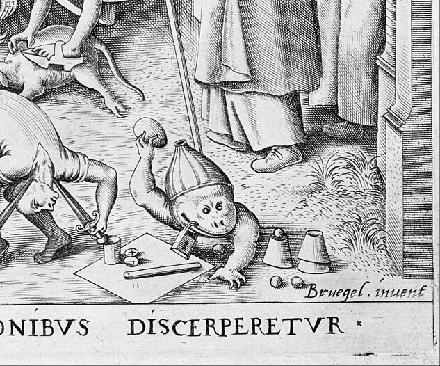 Descendons un peu, et admirons la version du décapité parlant de Brueghel ! On peut voir sur la gravure une tête découpée posée sur une assiette, le restant du corps gisant sur la table. A côté de la table, on aperçoit un petit diablotin qui se perce la lance et la main avec des lames.