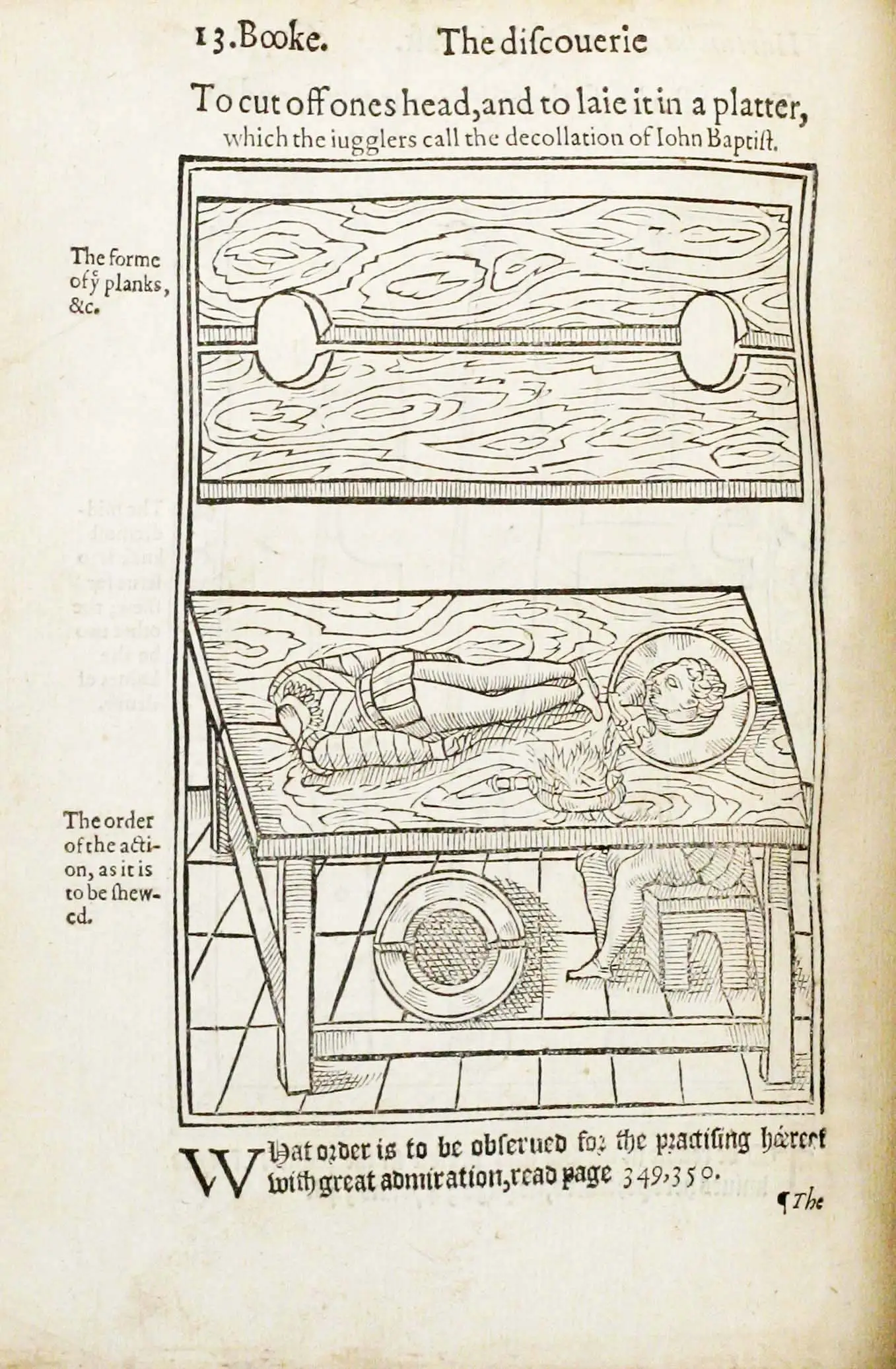 Devant ces nombreux effets magiques qui sont des références explicites à la magie de l’époque, on peut se demander si le dessinateur, Pieter Brueghel, n’était pas lui-même magicien. En tous cas, il est certain qu‘il avait des connaissances sur le monde de la magie tant les détails sont précis et juste. Prenons l’exemple de la « décollation de Saint Jean Baptiste » (le nom de l’effet de décapité parlant). Cet effet est déjà décrit dans le livre Discoverie of witchcraft de Reginald Scot en 1584. Comparez par vous-même la gravure expliquant la méthode (à gauche) et le détail du dessin de Pieter Brueghel (à droite). Vous remarquerez la présence d’une nappe pour cacher le secret du tour, et une d’assiette pour la tête, la gravure est presque un copier-coller !