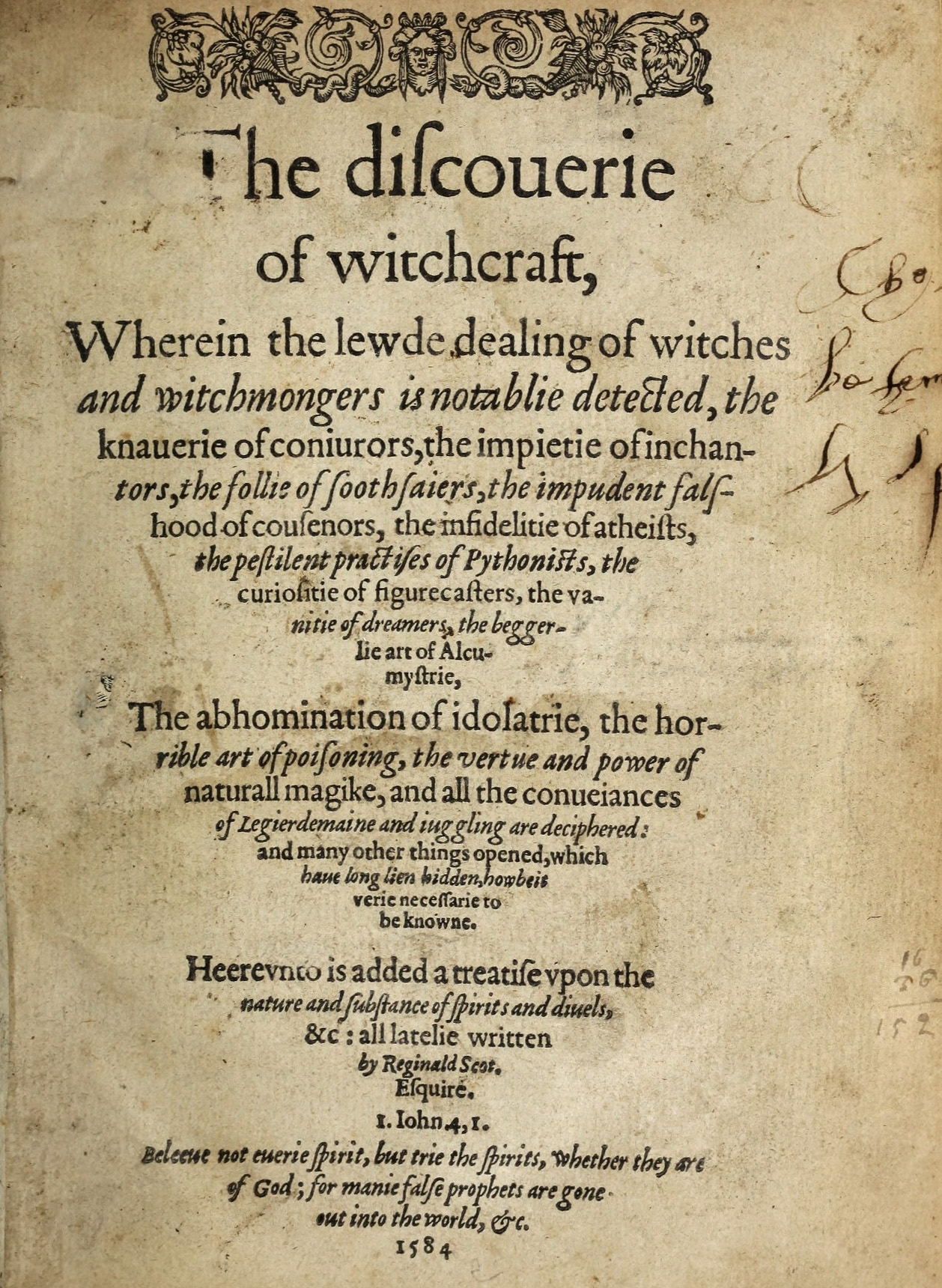 En 1584, Reginald Scot, un politicien anglais calviniste, publie The Discoverie of Witchcraft (que l’on pourrait traduire par La Sorcellerie Démystifiée). L’ouvrage est un cheminement en seize livres qui, étape après étape, démontre qu’en dehors des manifestations divines, les phénomènes surnaturels n’existent pas. Ainsi, The Discoverie of Witchcraft devient l’outil politique de Scot pour mettre fin aux persécutions des accusés de sorcellerie et autres magies diaboliques.
