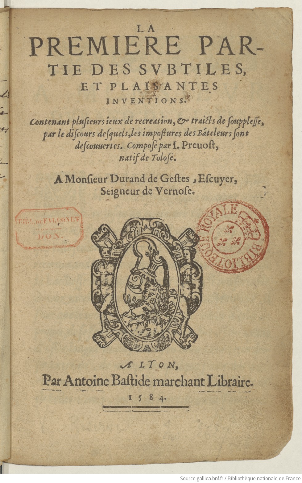 Nous sommes en 1584. Cette année-là paraît à Lyon un livre au nom surprenant : La première partie des subtiles et plaisantes inventions.