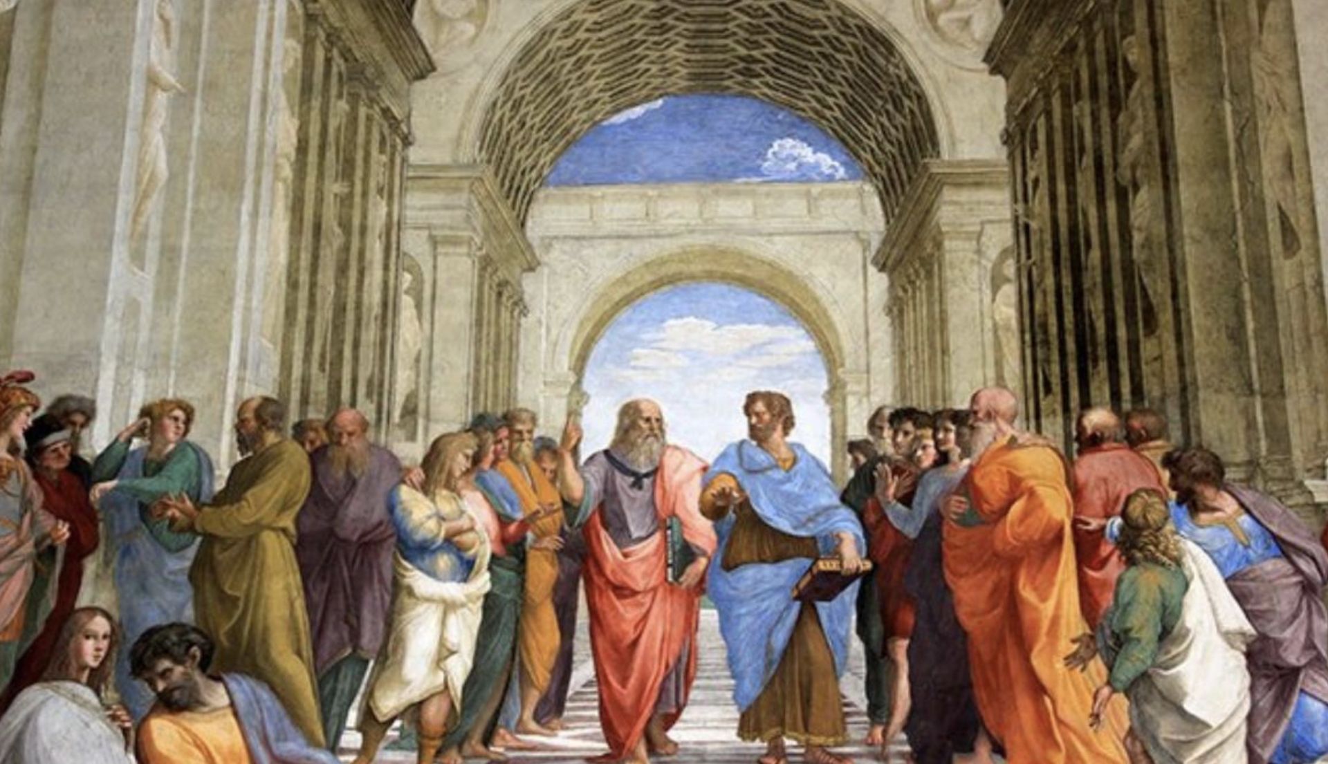 « L'École d'Athènes » de Raphaël. Cette fresque symbolise les figures majeures de la pensée antique, l’univers de la Philosophie comme un chemin vers la connaissance. Palais du Vatican, 1511