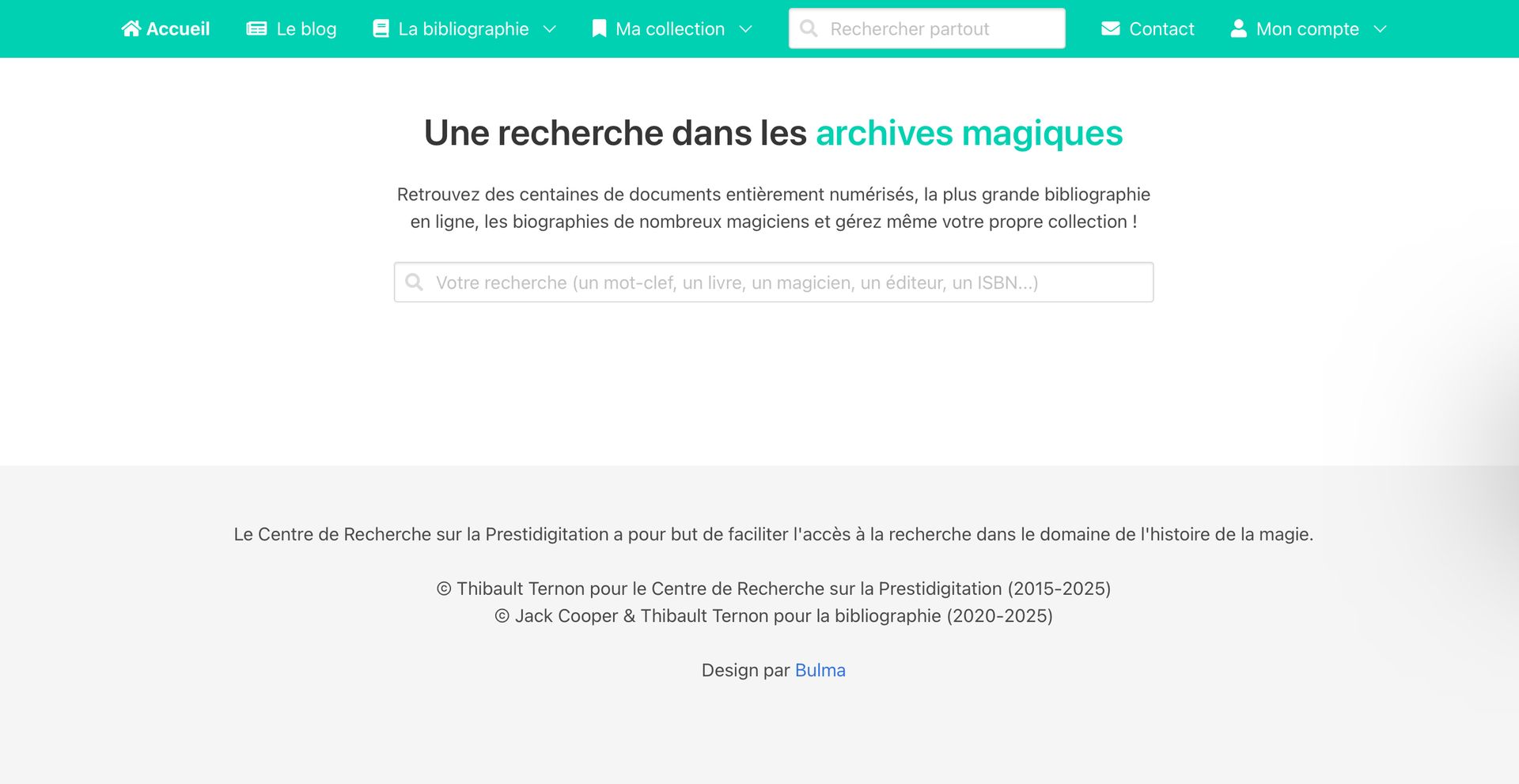 Le principe de ce site est simple : référencer de manière exhaustive les livres publiés en français sur la prestidigitation, et ce, avec la plus grande rigueur. Le site se veut accessible à tous, gratuit et participatif pour créer la plus grande base de données possible. Ainsi, il est possible en une simple recherche de voir toutes les publications d’un auteur, d’en savoir plus sur un livre en particulier, et même de gérer sa propre collection d’ouvrages, tout cela de manière fluide et simple.