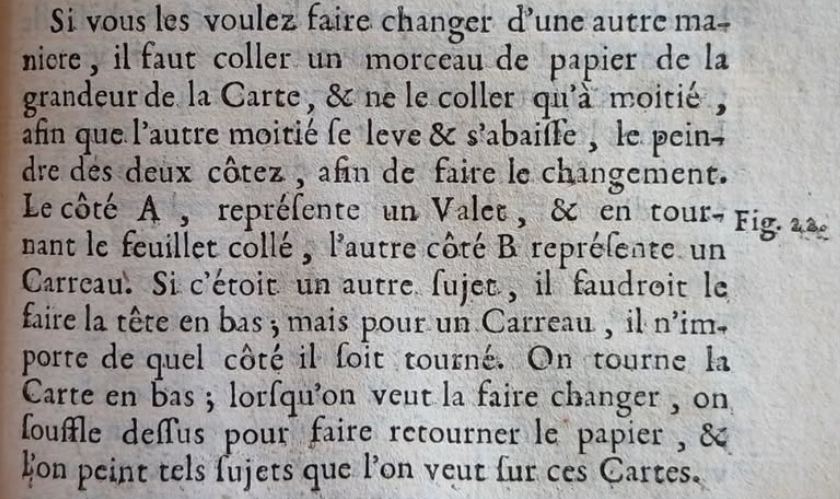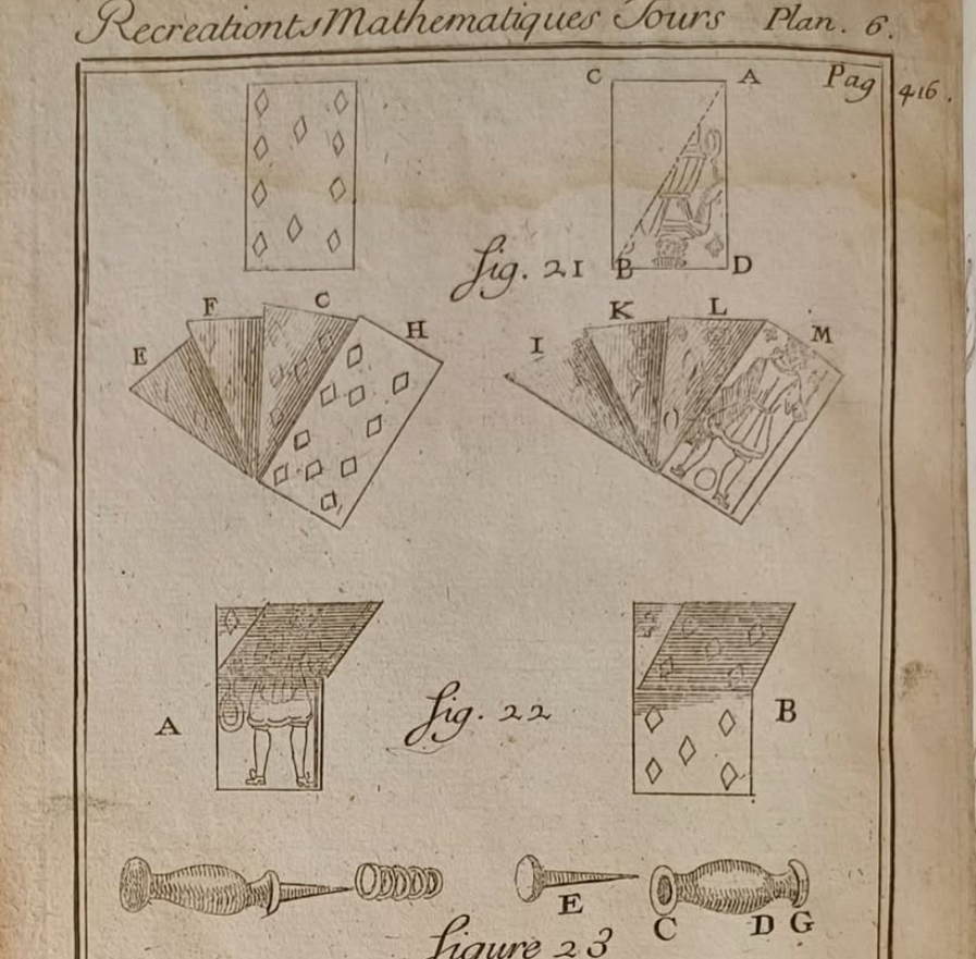 Cependant, cette idée de trucage n’est pas (du tout) nouvelle ! Sans en faire la première référence, on trouve au moins dès le XVIIIe siècle des traces de cartes flap dans les Récréations mathématiques et physiques.